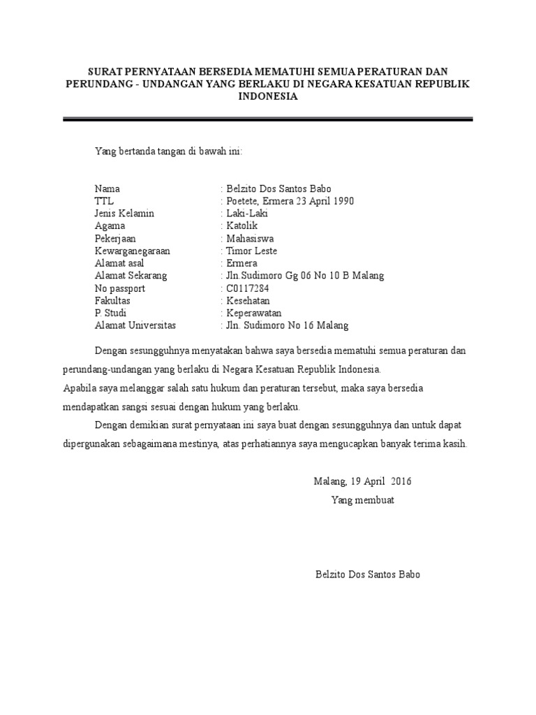99 macam contoh surat pernyataan berbagai keperluan yang baik dan benar lengkap. Contoh surat perjanjian kontrak rumah sederhana contoh surat ada banyak contoh surat pernyataan yang biasanya banyak digunakan, mulai dari surat pernyataan belum menikah, surat pernyataan diri. 18 contoh surat pernyataan mematuhi peraturan perusahaan. Berikut ini adalah sebuah contoh surat tentang kesediaan mahasiswa kuliah untuk mematuhi semua segala peraturan yang ada di kampus. Surat pernyataan yang menyatakan menaati peraturan perundang undangan contoh surat pernyataan kesanggupan mematuhi peraturan doc by posted on september 20, 2020